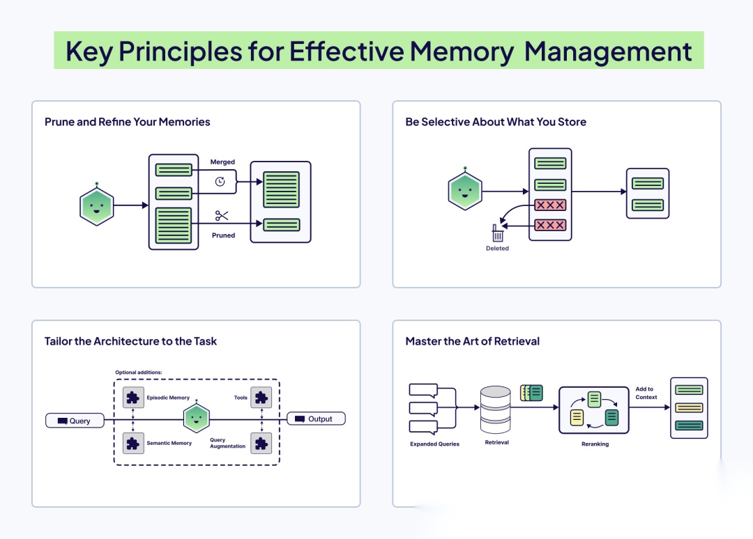 一旦进入存储,记忆就需要维护。定期修剪、合并重复项、删除过时事实,以及用紧凑的摘要替换长篇记录,可以保持检索的敏锐度,防止上下文窗口被历史杂波填满。像“最近性”和“检索频率”这样的标准是简单但强大的信号,用于决定保留什么和淘汰什么。