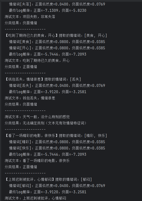 System.out.printf(" 最终log概率:正面=%.4f,负面=%.4f%n", posLogProb, negLogProb);