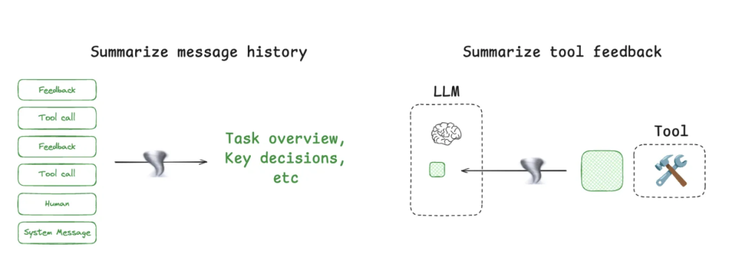 - Context Summarization:座席交互可以跨越数百个回合 ,并使用令牌密集型工具调用。摘要是管理这些挑战的一种常见方法。如果您使用过 Claude Code,您就会看到这一点。Claude Code 在您超过 95% 的上下文窗口后运行“ 自动压缩 ”,它将总结用户与Agent交互的完整轨迹。这种跨Agent轨迹的压缩可以使用各种策略,例如递归或分层摘要。