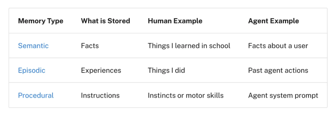 - Memories:如果Agent有能力保存记忆,他们还需要能够选择与他们正在执行的任务相关的记忆。这可能很有用,原因有几个。Agent可能会选择少量示例( 情景记忆 )作为所需行为的示例,选择指令( 程序记忆 )来引导行为,或选择事实( 语义记忆 )作为任务相关上下文。