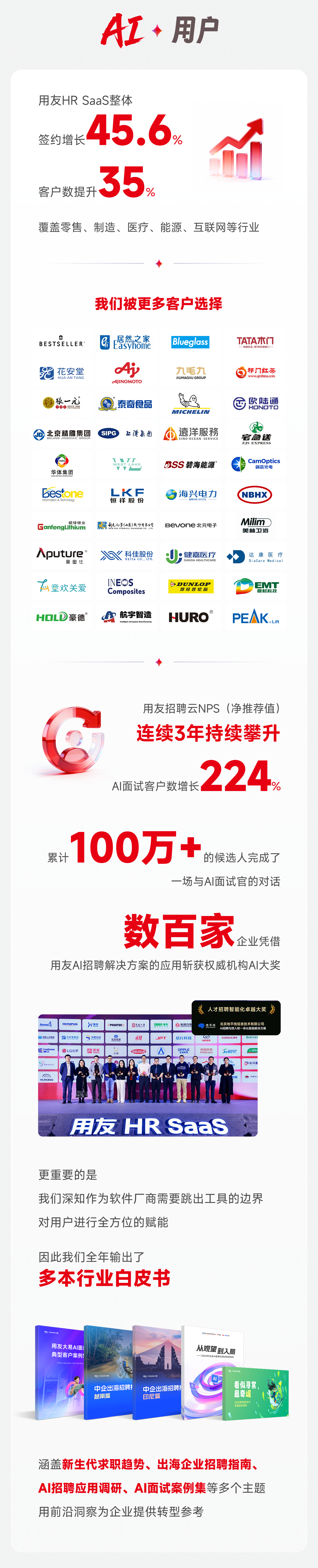 2025 年这一年,用友HR SaaS产品端重磅发布 9 大 AI 智能体,覆盖招聘、人事、薪酬等全场景,为 200w + 用户带来效率革命 —— 招聘决策准确率提升 76%、到岗周期缩短 45%,更驱动员工绩效与劳动生产率显著增长。市场端持续爆发,签约增长 45.6%、客户数提升 35%,AI 面试服务吸引 100 万 + 候选人参与