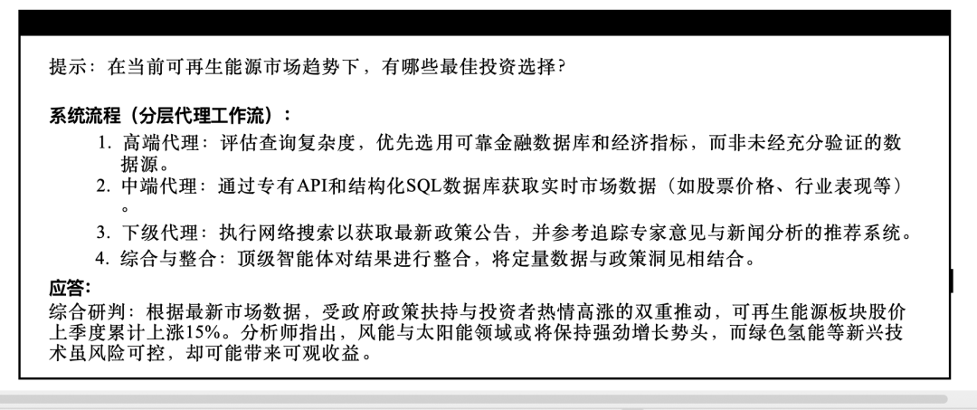 - 下属代理的委派:顶级代理将任务分配给专精于特定检索方法(如SQL数据库、网络搜索或专有系统)的下级代理。这些代理独立执行其分配的任务。
