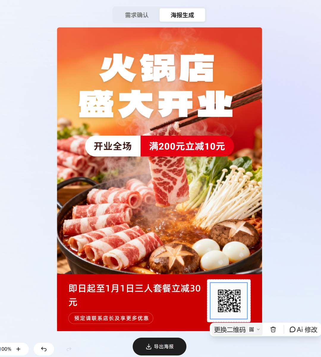下面来一张线下的美食开业海报,输入框下方可以传二维码和LOGO。