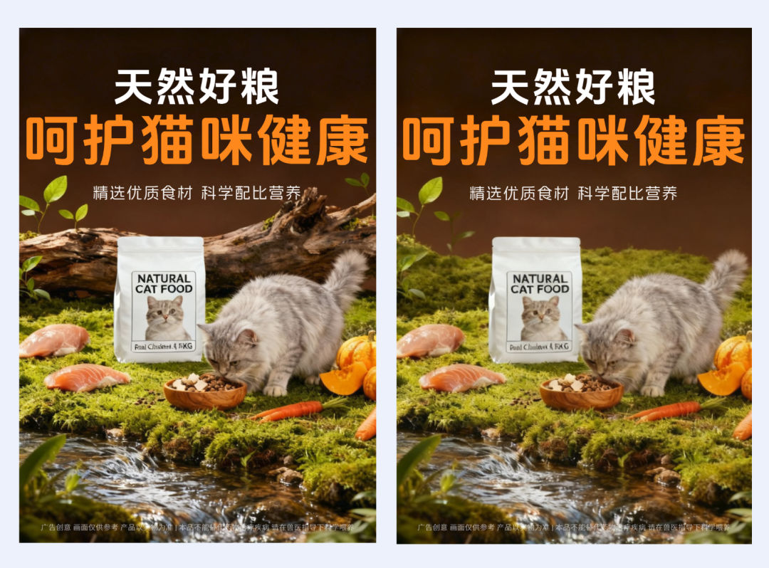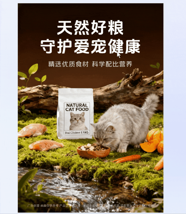 然后在对话框中输入提示词,并且上传一张产品图。生成一张猫粮海报看下。