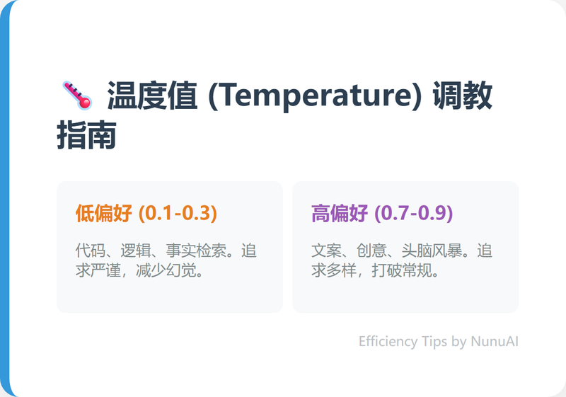 * 0.2:写 SQL、查 API 文档、或者做系统架构设计时,死守这个值。别让 AI 发挥创意,我们要的是确定性。