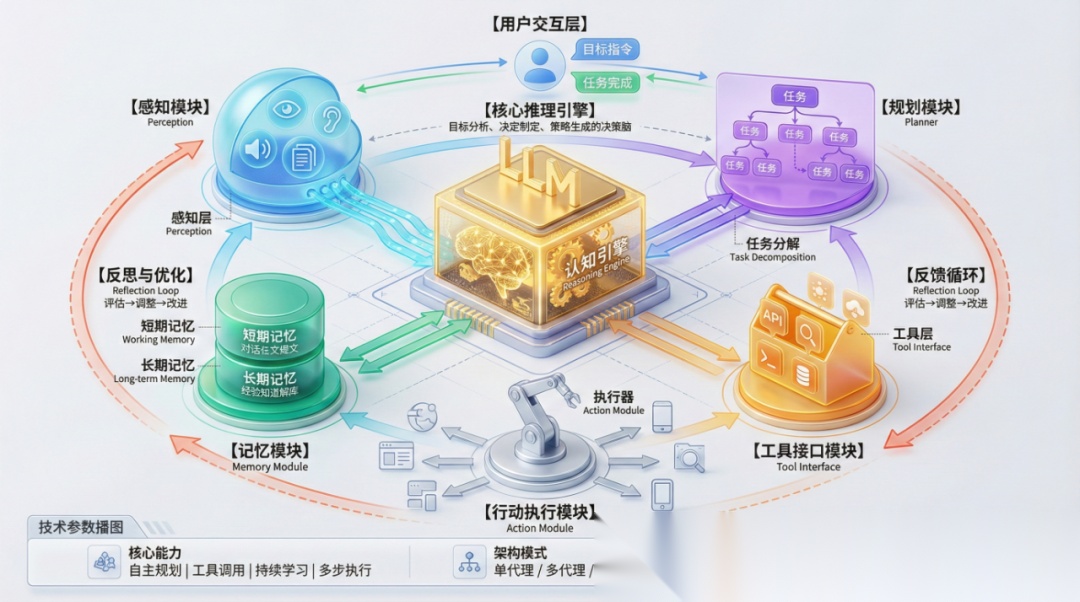 Agentic AI 工作循环感知环境Perceive推理决策Reason执行动作Act观察反馈Observe最小化人工干预的自主决策循环