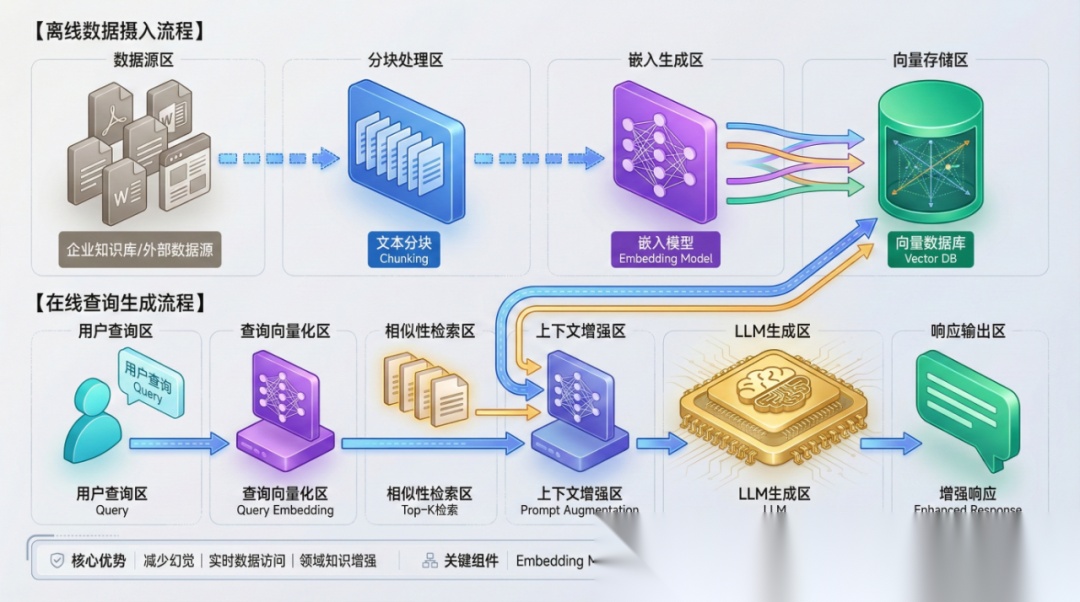 RAG 本质上是一个"外挂知识库"系统,让 LLM 能够访问训练数据之外的信息。它分为两个阶段: