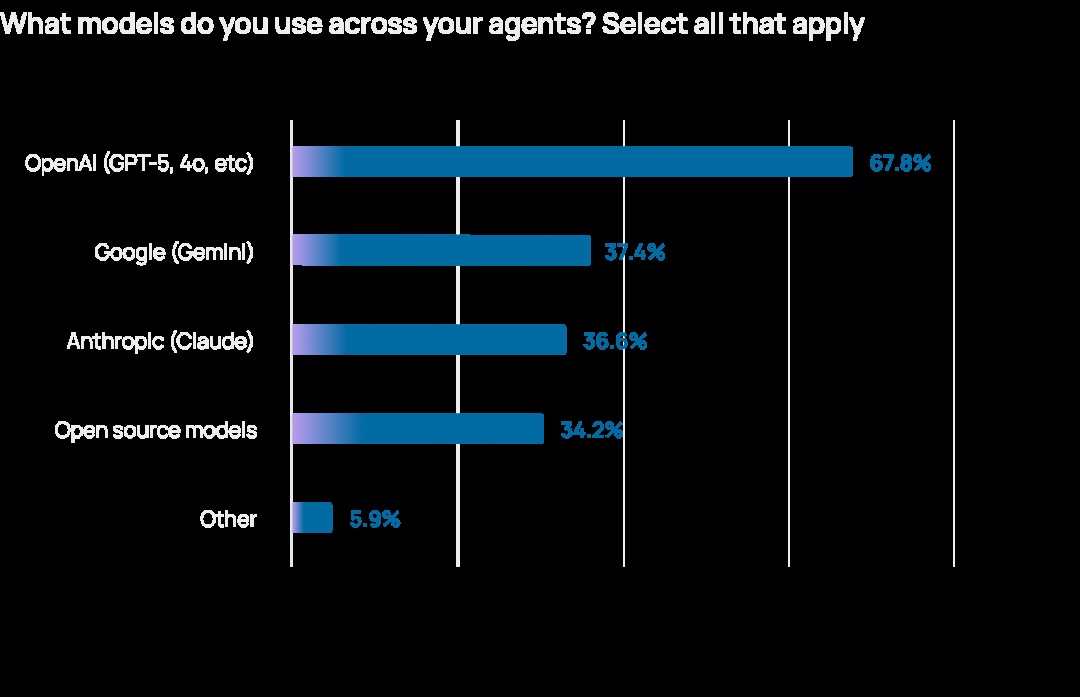 超过三分之二的组织使用OpenAI的GPT模型,但模型多样性是常态——超过四分之三的组织在生产或开发中使用多个模型。团队越来越多地根据复杂度、成本和延迟等因素将任务路由到不同的模型,而不是被单一平台锁定。