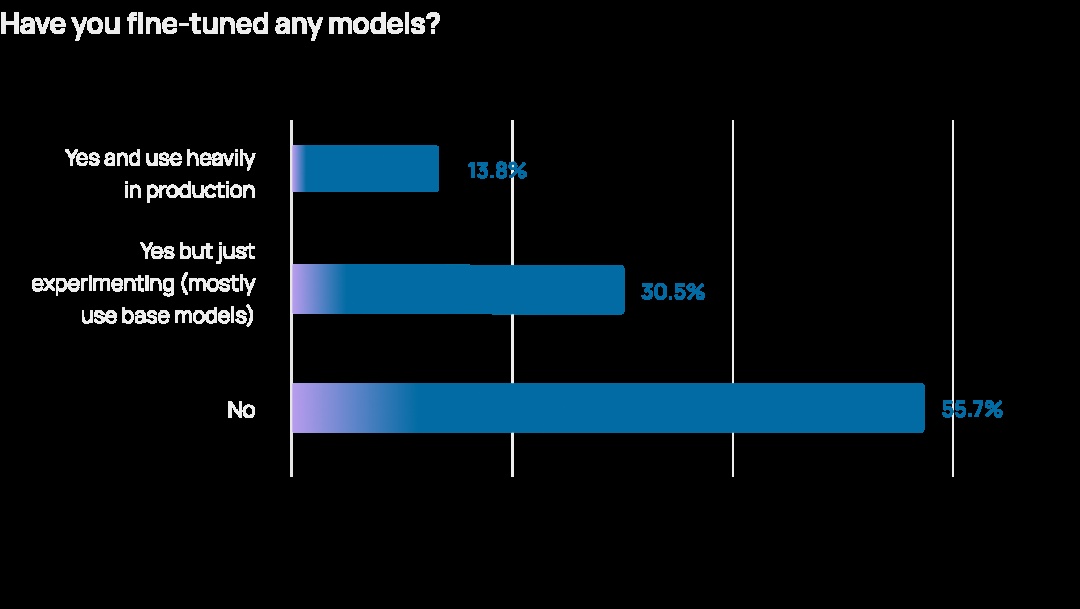 同时,微调仍然是专业化而非标准化的做法。大多数组织(57%)不进行微调,而是依赖基础模型结合提示工程和RAG。由于微调需要在数据收集、标注、训练基础设施和持续维护方面进行大量投资,它似乎主要用于高影响或专业化的用例。