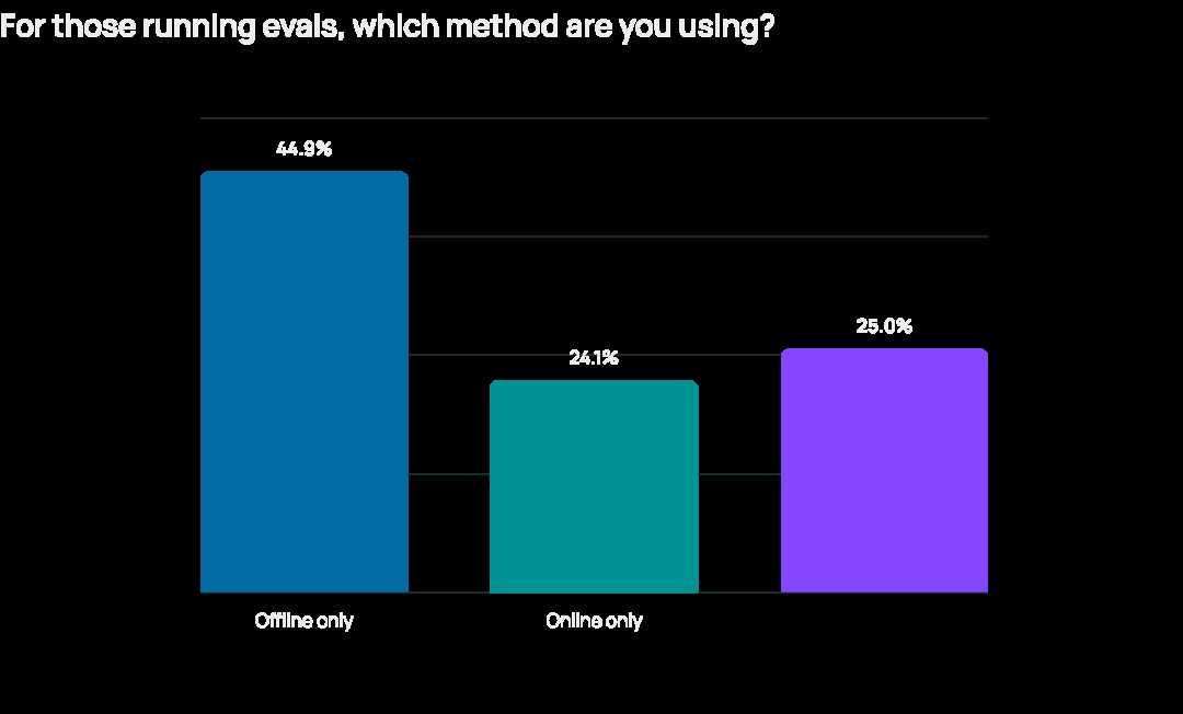 大多数团队从离线评估开始(门槛较低、设置更清晰),但许多团队正在采用分层方法。在运行评估的组织中,近四分之一同时结合了离线和在线评估。