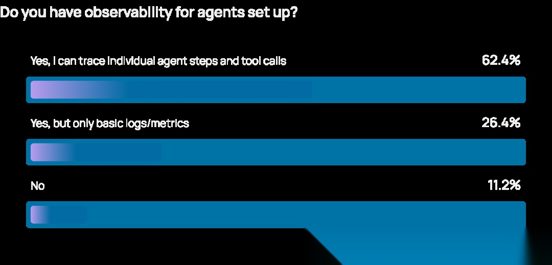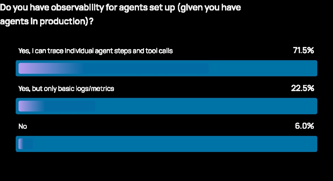 在已将Agent投产的组织中,采用率更高:94%实施了某种形式的可观测性,71.5%具备完整追踪能力。