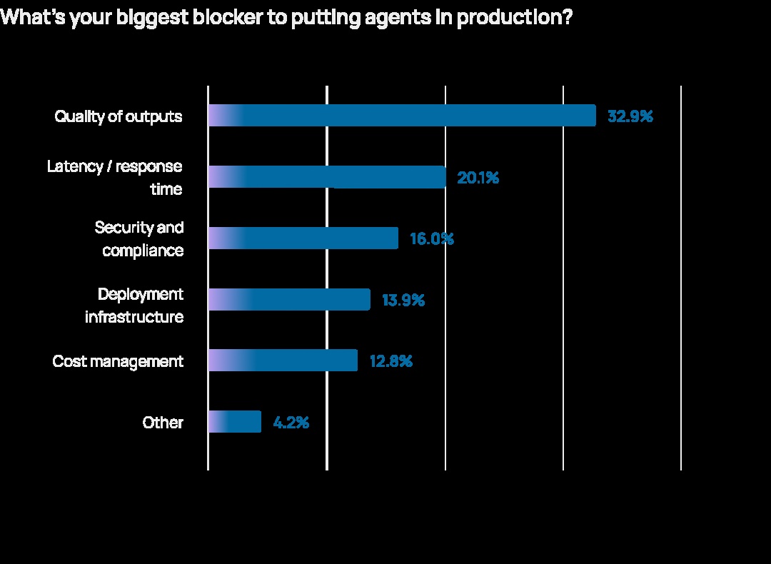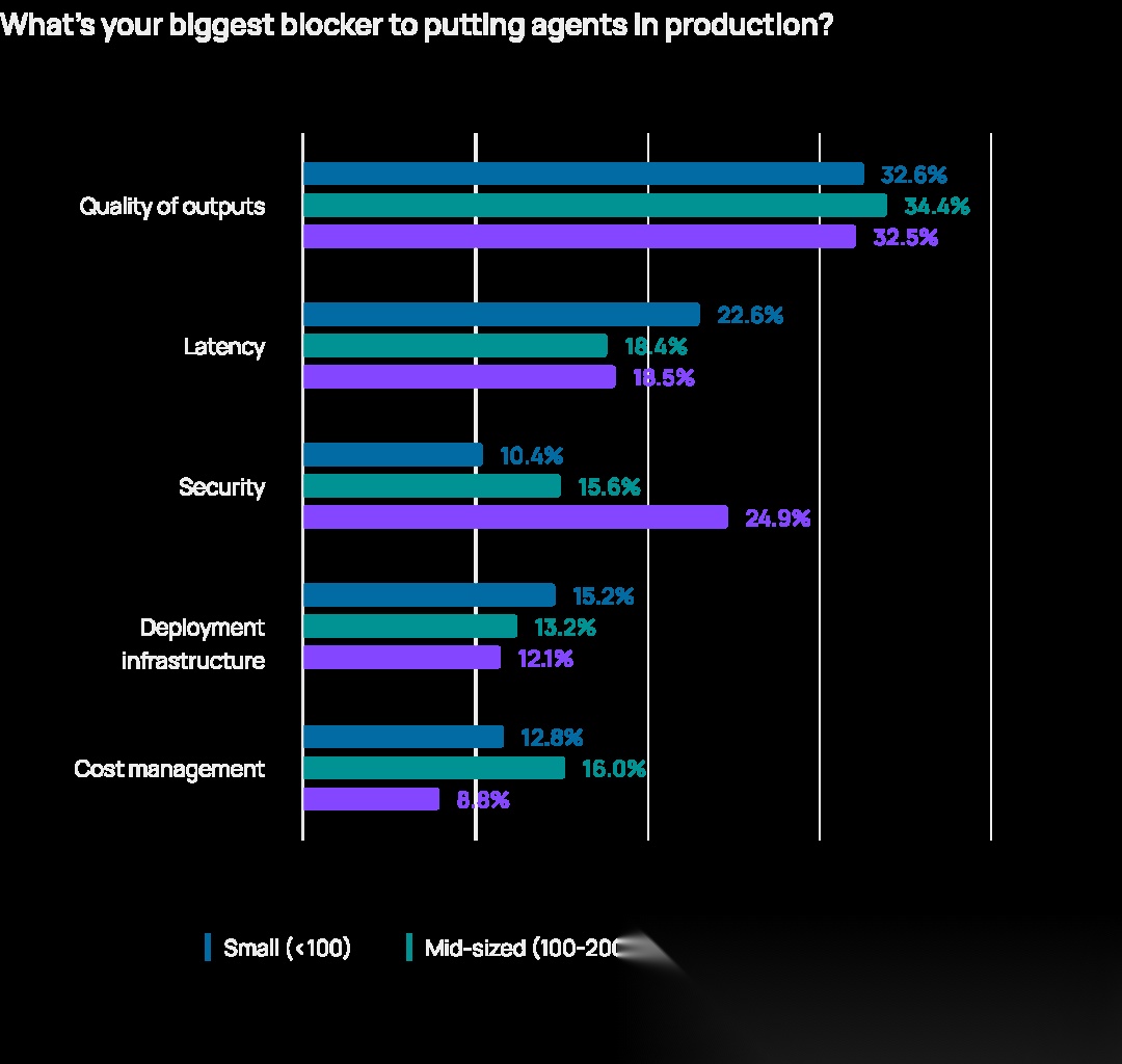 质量问题是Agent投产的最大障碍,与去年调研结果一致。今年,三分之一的受访者将质量列为首要阻碍因素,这涵盖了准确性、相关性、一致性,以及Agent保持正确语气并遵守品牌或政策指南的能力。