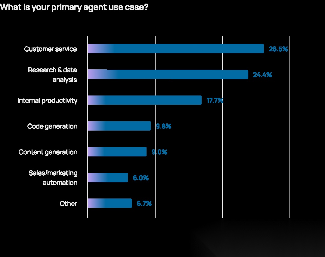 客户服务成为最常见的Agent应用场景(26.5%),研究与数据分析紧随其后(24.4%)。这两大类别占据了所有主要Agent部署的一半以上。