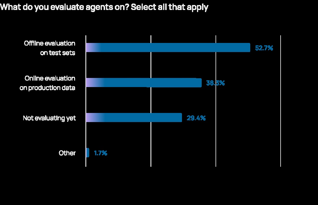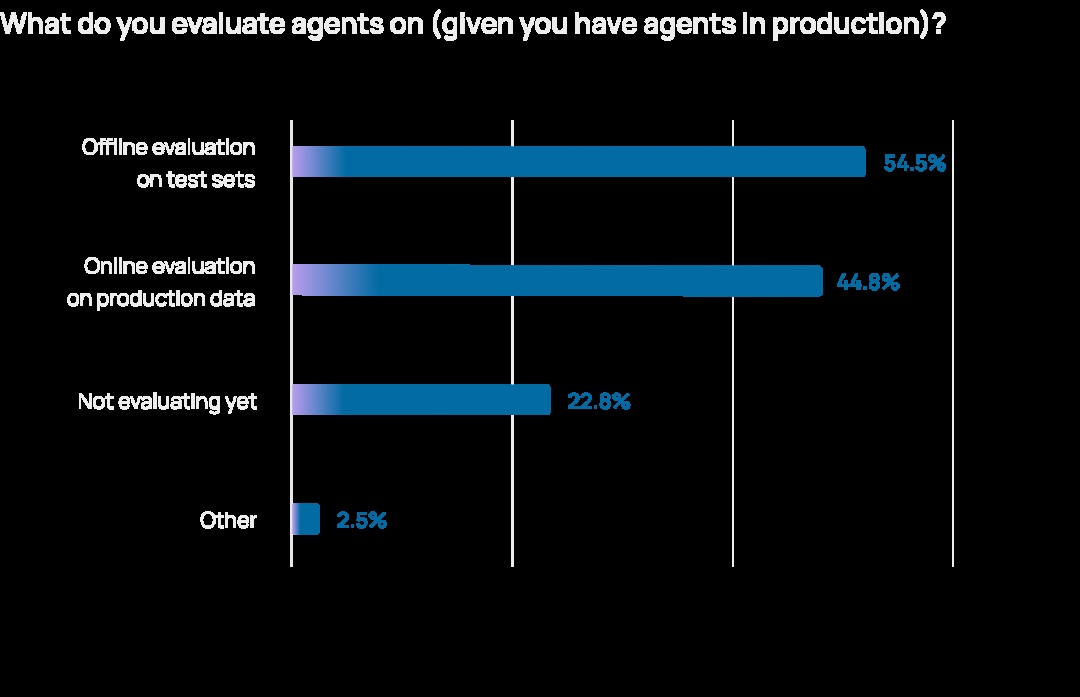 对于已投产的Agent,评估实践更加成熟:未进行评估的比例从29.5%降至22.8%,在线评估的采用率达到44.8%。