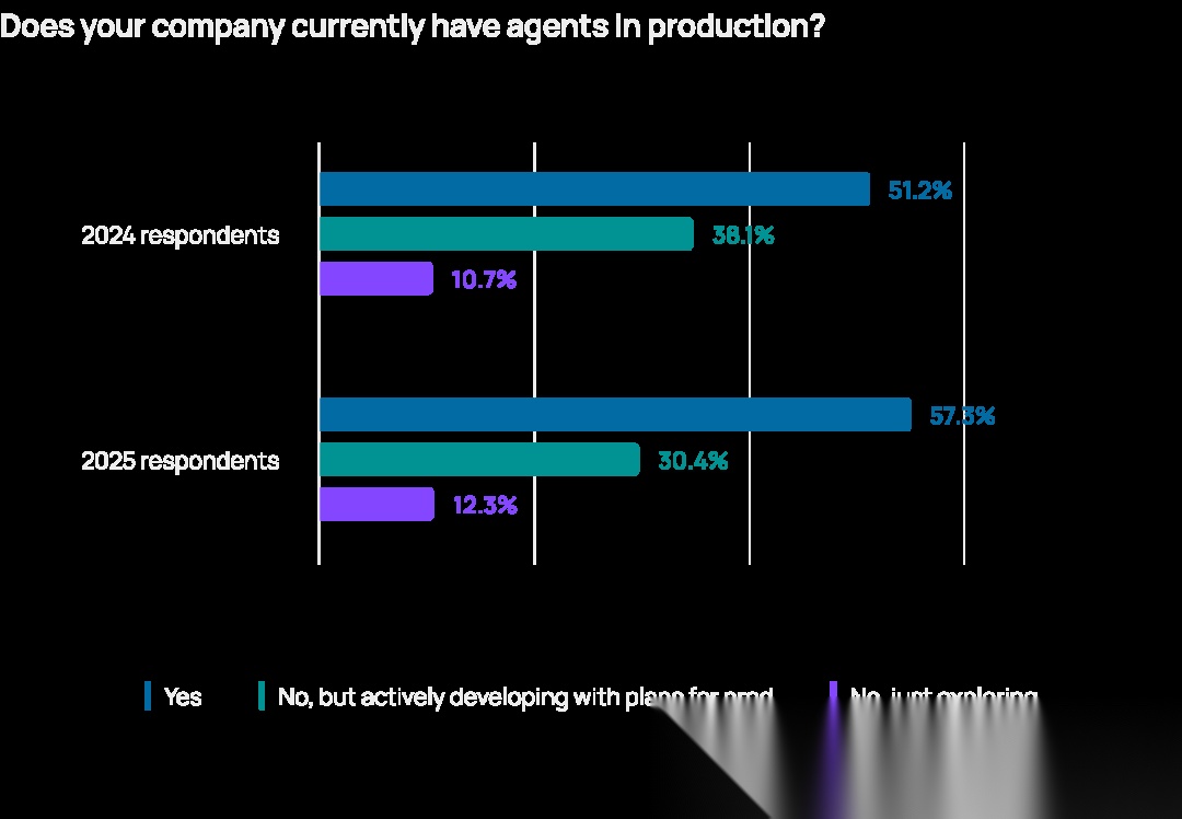 57.3%的受访企业已经将Agent部署到生产环境,另有30.4%正在积极开发并计划部署。相比去年的51%,这标志着明显的增长。