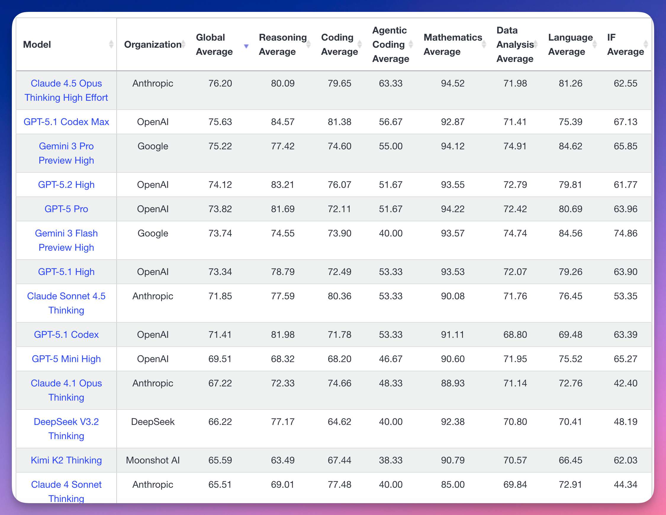 Anthropic Claude 4.5 Opus Thinking High Effort 以 76.20 分排第一。