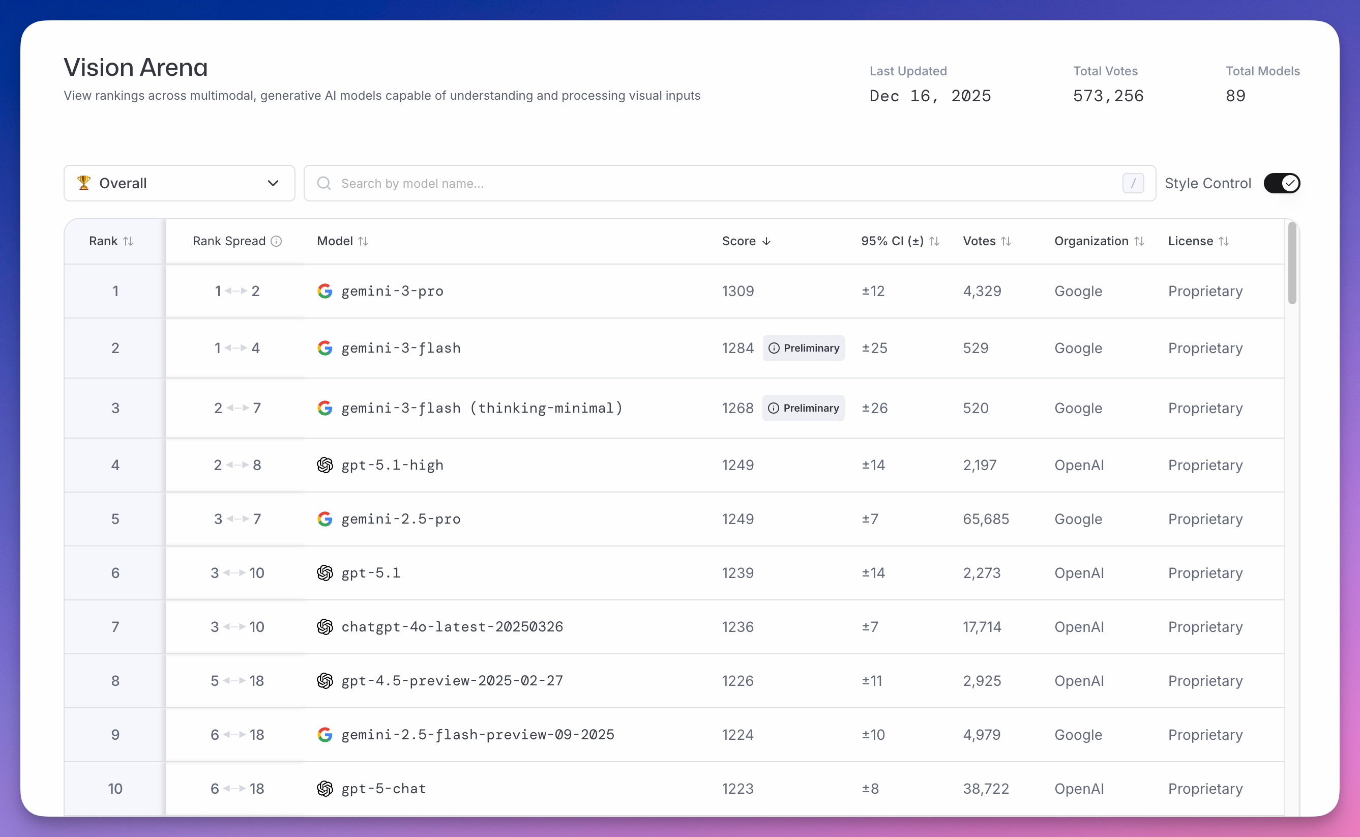 Vision Arena 测试模型理解和处理图像(多模态)的能力,截至 12 月 16 日累计 57 万票。