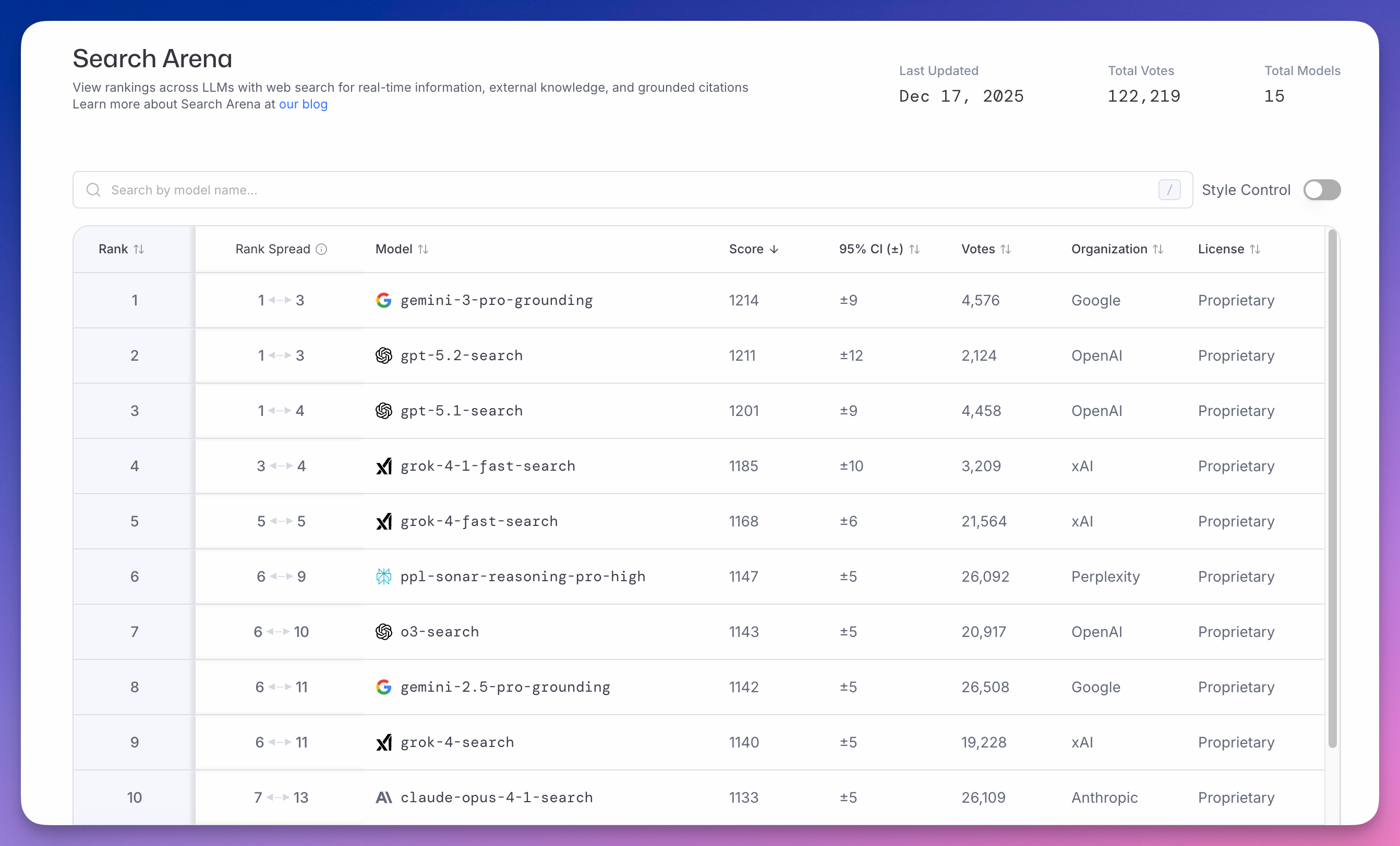 Search Arena 测试模型联网搜索的能力,截至 12 月 17 日累计 12 万票。