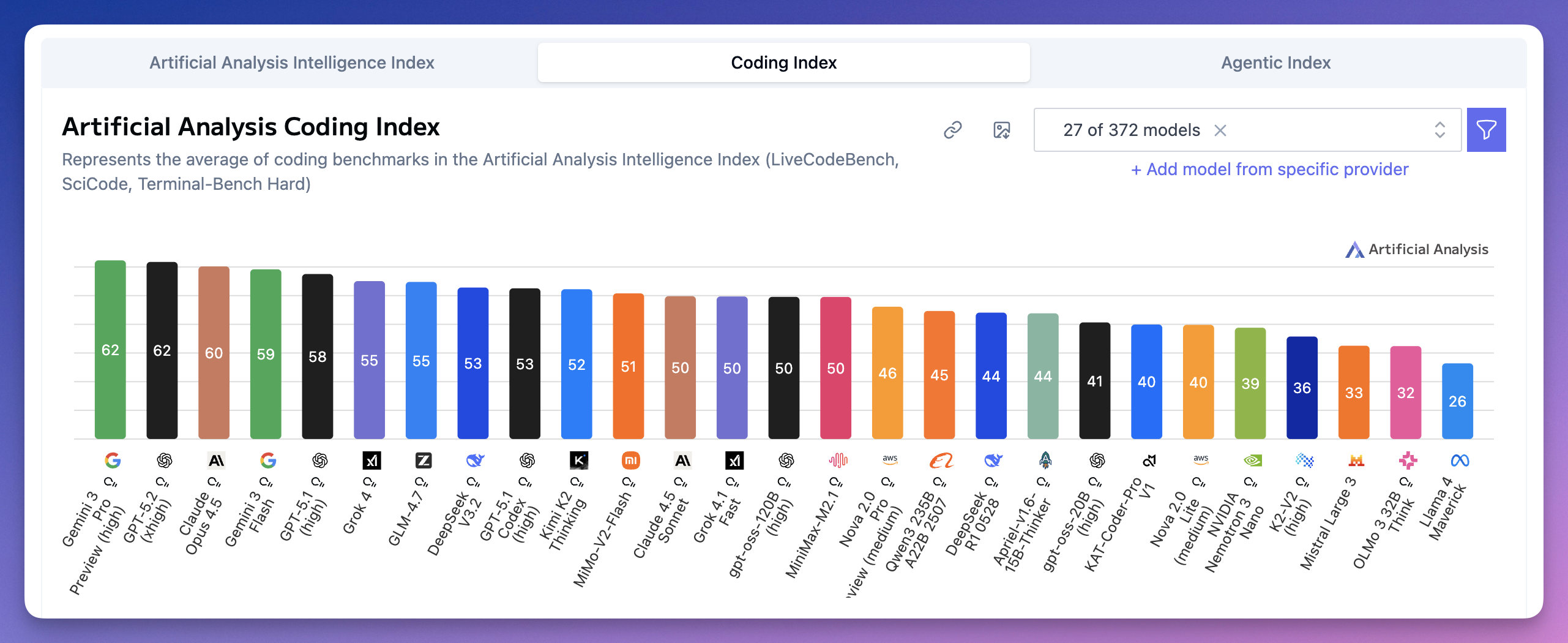 Coding Index(编程能力)榜,谷歌 Gemini 3 Pro 和 OpenAI GPT-5.2 并列第一,都是 62 分。