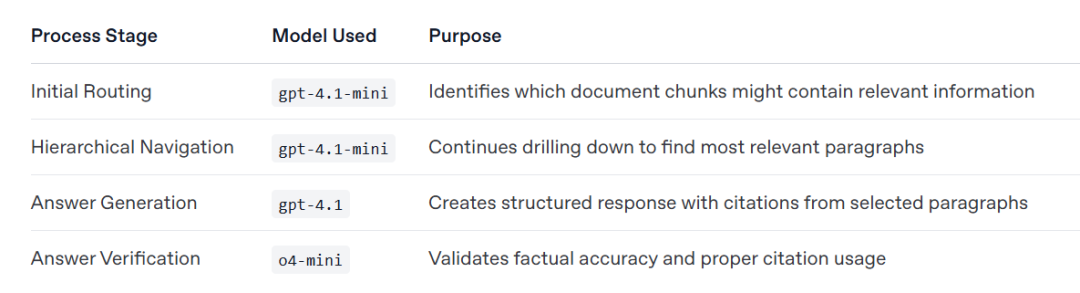 - 模型路由:将这些大块和用户问题一起发送给 GPT-4.1-mini 模型。该大模型基于其强大的自然语言理解能力,识别出哪些大块可能包含相关信息。选择 GPT-4.1-mini 是因为其巨大的上下文窗口(100 万 Token)和较低的成本,非常适合处理大量文本的初步筛选。