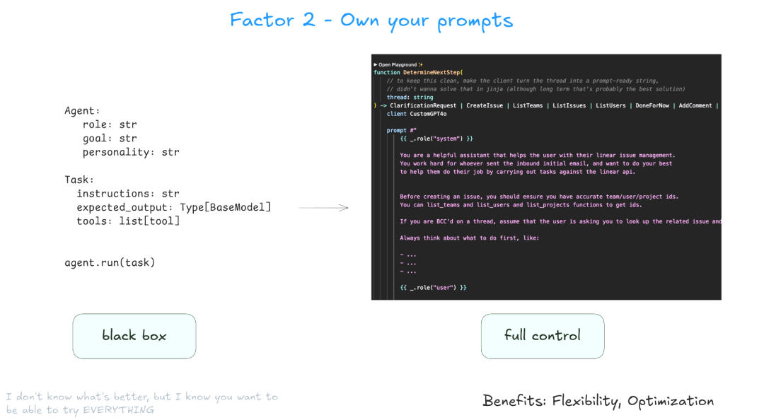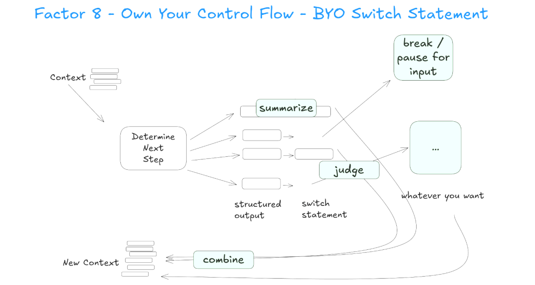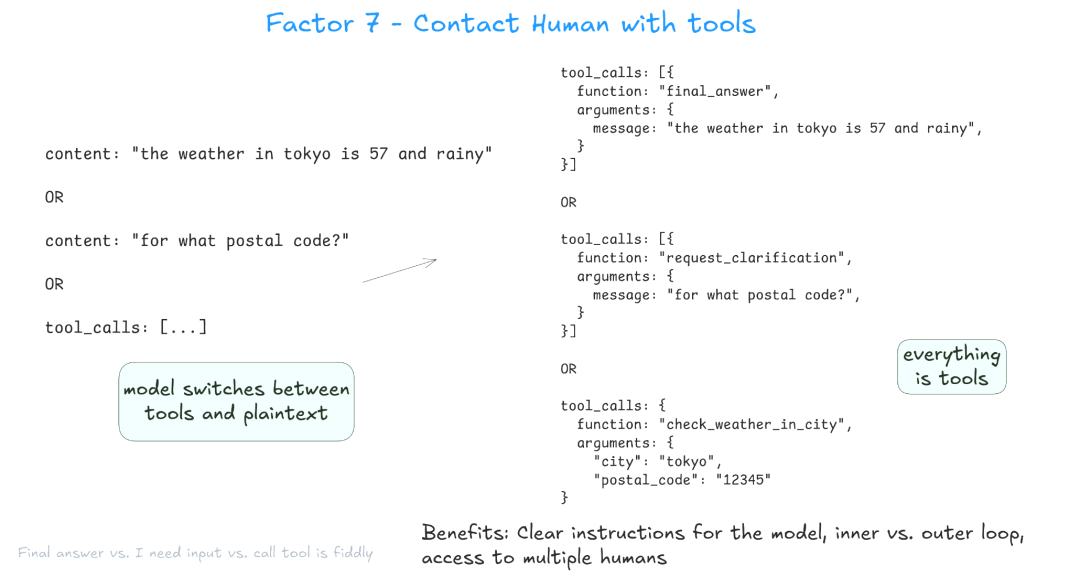 更优的方案是让大语言模型始终输出 JSON 结构化数据,然后通过自然语言词元(如 request_human_input或 done_for_now)来声明意图,而不是依赖类似 check_weather_in_city这样的“标准”工具。
