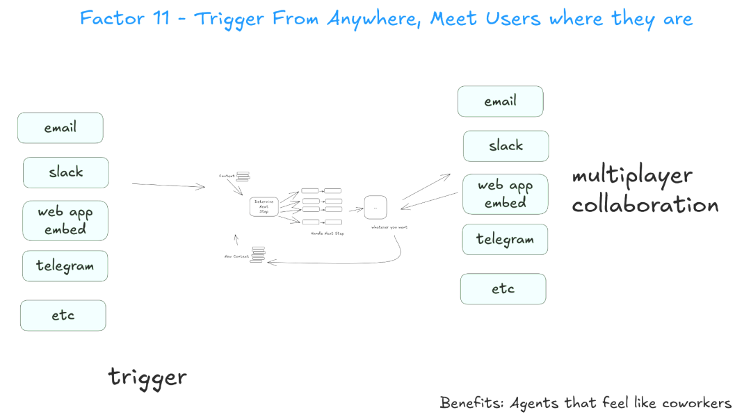 支持用户通过 Slack、邮件、短信等任意渠道唤醒智能体,并确保响应始终在原对话流中完成。