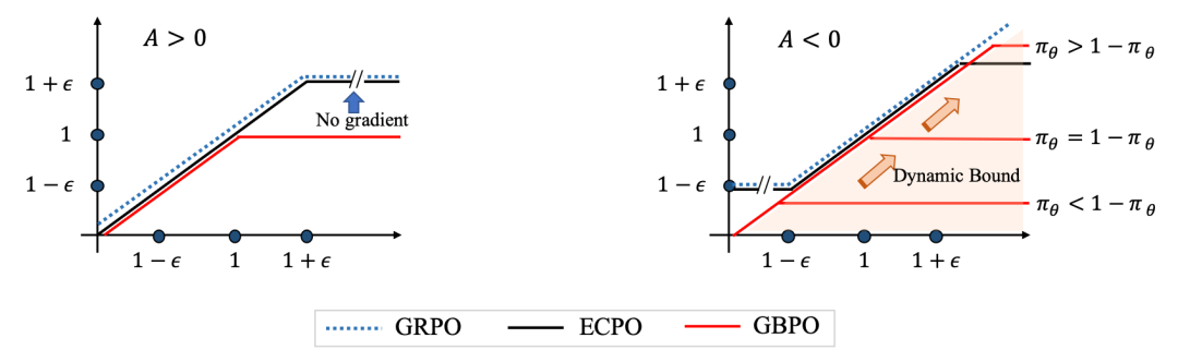 在强化学习算法上,分别提出了ECPO和GBPO方法,两者都是在PPO中的clip上做优化。ECPO中,对负向value的梯度的最大值也进行了约束,防止出现梯度爆炸问题,提升训练稳定性。在GBPO中,对于负样本提出了动态clip的方法,其核心逻辑为,一个负样本如果预测概率比较低,其进一步优化的空间就很小了,因此梯度应该比较小才合理,但是GRPO中并没有这种根据预测概率动态调节梯度的方法。在基础的BCE中,梯度中的1-p可以起到这个平滑作用,因此GBPO引入类似的方式,直接用1-行为概率预测结果作为负样本的动态clip边界。