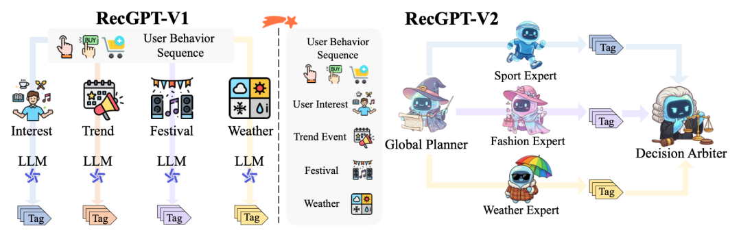 在RecGPTV2中,也采用了强化学习的方法对RecGPTV1进行偏好对齐。RecGPTV2采用GRPO进行优化,主要差异是在reward的设计上。在每个Expert的训练上,reward综合考虑了item tag预测的准确率、基于用户偏好对训练的奖励模型的打分、生成结果的多样性(每个tag映射成表征计算两两cosine距离的均值)等。可以看到在推荐大模型领域,reward的设计会更加复杂,需要综合考虑用户偏好、多样性、负反馈等各种信息。