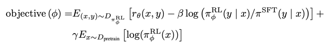 整体的损失函数表示如下,其中第一项是PPO损失,文中将PPO的KL散度约束改成了per-token的,即预训练模型和偏好对齐后的模型每个token的分布不能差异太大。同时也引入了前序非强化学习的预训练loss进行混合训练。