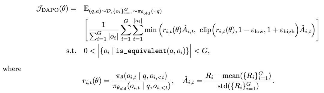DAPO: An Open-Source LLM Reinforcement Learning System at Scale(2025) 针对PPO、GRPO在大模型上应用存在的问题进行了多个细节优化。首先是将PPO中重要性采样引入的约束项的clip上限放开,Clip的作用和KL相似,都是为了让新参数和老参数产出的行为分布差异不要太大。但这种方式限制了低预估概率探索token的生成,同时高预估概率的探索token很难被限制住。其次是在GRPO的采样上,随着训练的进行有很多采样结果可能reward都是准确的且相同的,这些采样结果让模型在后期训练变慢,因此文中将采样次数提升,同时去掉其中完全准确的采样结果。对于序列长度的差异,之前采用sample维度求token loss平均计算loss,对于长句子来说每个token生成的好与坏被平滑掉了,因此文中将sample级别的loss改成token级别的loss。对于过长句子被截断的影响,文中发现这部分样本会影响训练稳定性(也是由于改成了token维度loss带来的负面效果),因此针对这些句子根据其超出最大长度限制比例进行降权,超出长度越多loss权重越低。