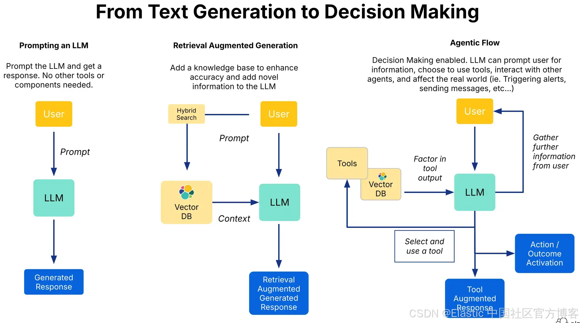 Agentic 模型的核心在于 LLM 能够根据用户输入采取特定的行动。这些行动可能涉及使用工具来增强 LLM 现有的能力。从这个意义上说, RAG 充当一个长期记忆存储, LLM agent 可以选择使用它来增强和强化对用户查询的回答。传统的 RAG 模型是由 LLM 查询一个或多个知识库,而 agentic 实现则允许 LLM 从一组知识库中进行选择。这使问答行为更加灵活,并且可以提高准确性,因为无关知识库中的信息会被省略,从而减少潜在的噪声来源。我们可以将这样的系统称为 “ agent 知识库 ”。下面我们来看看如何使用 Elasticsearch 实现这样一个系统。