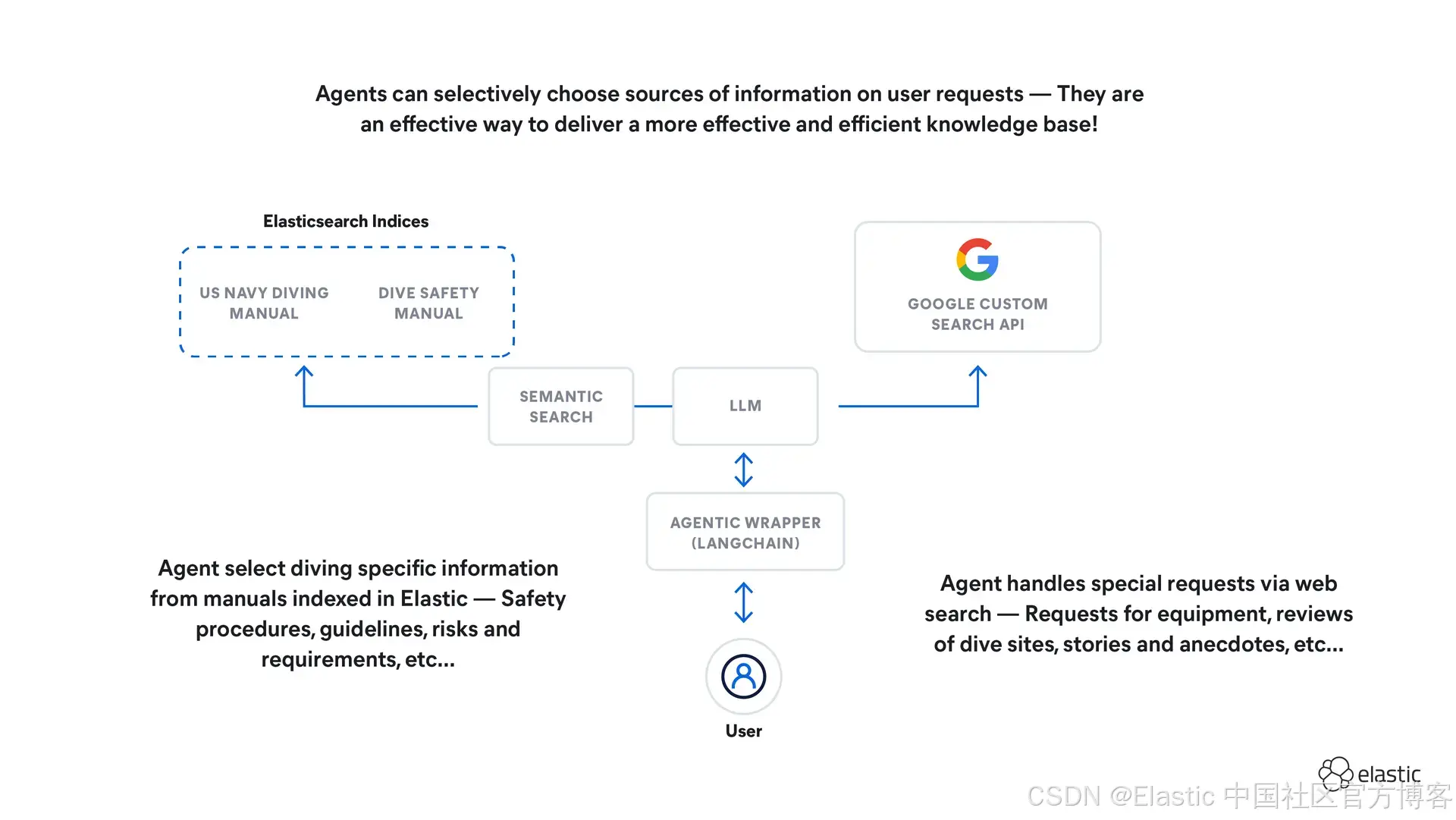 本文介绍了如何利用Elasticsearch构建一个智能代理知识库系统。该系统通过结合大型语言模型(LLM)的决策能力和检索增强生成(RAG)技术,实现了更精准的信息检索。作者以潜水知识库为例,整合了美国海军潜水手册、潜水安全手册和Google搜索API三个数据源,使用LangChain框架创建代理工具集。测试表明,该系统能根据查询意图智能选择数据源,避免无关信息干扰,并能处理超出知识库范围的问题