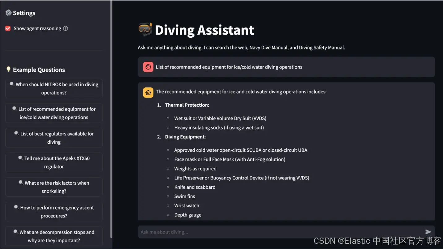 目标是让这个 Diving Assistant 成为潜水相关知识的一站式工具,能够回答任何查询,即使是超出已导入知识库范围的问题。 LLM 会识别用户查询背后的动机,并选择最可能相关的信息源。我决定使用 LangChain 作为 agentic 包装器,并在其上构建了一个 streamlit UI。