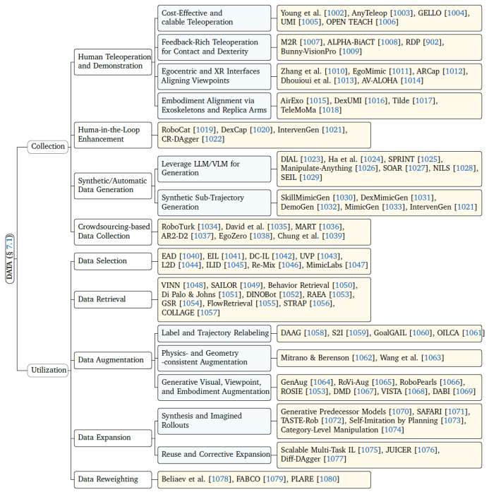 此外,我们首次系统性地提出了关于关键瓶颈问题的分类框架,重点分析了数据采集、利用与泛化等核心挑战,并对机器人操作在实际场景中的应用进行了全面回顾。与以往综述相比,本工作不仅在内容上覆盖更广、层次更深,也在结构上提供了更清晰的知识脉络:既为初学者提供了快速入门的路线图,也为领域研究者提供了系统化的参考框架。