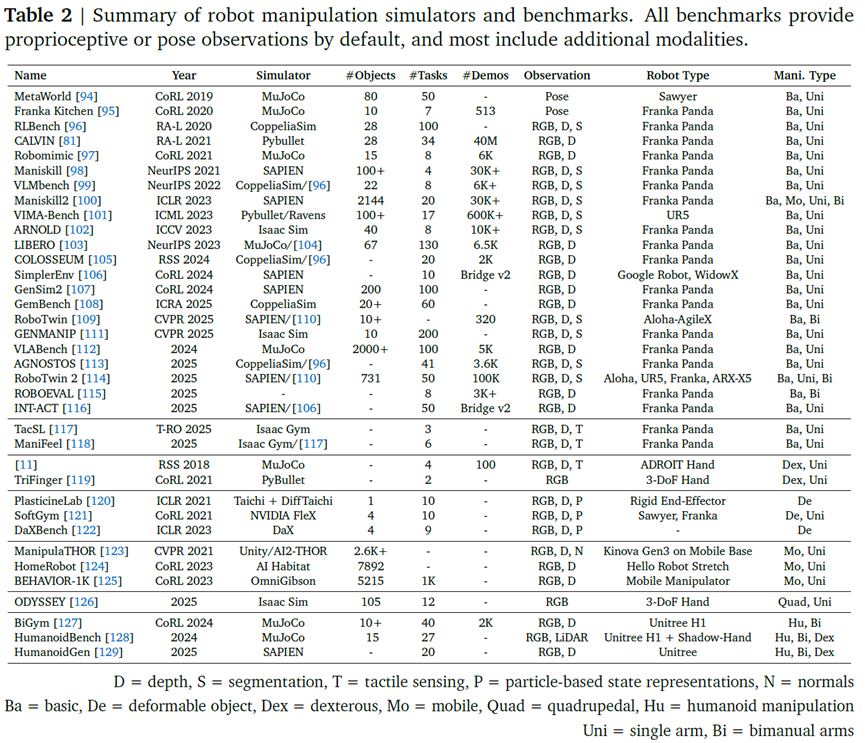 - 单 embodiment 仿真器与基准:基于单一机器人硬件平台构建的仿真环境与测试标准。