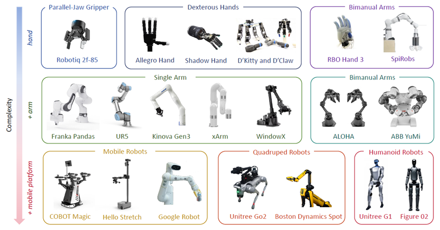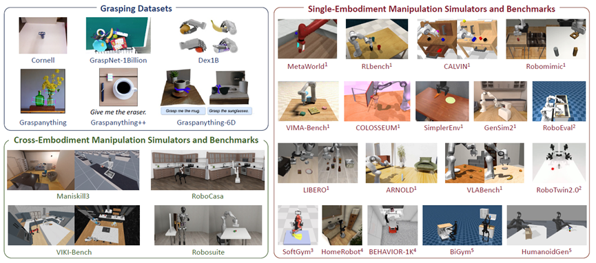 - 跨 embodiment 仿真器与基准:支持多种异构机器人硬件平台的仿真环境与测试标准。