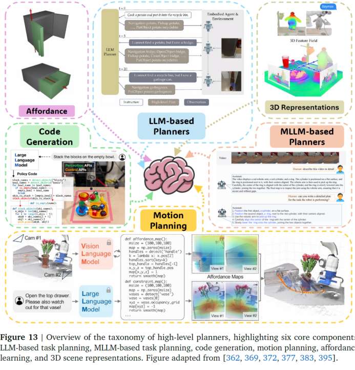 我们将高层规划从传统的任务调度扩展至语言、代码、运动、可供性(affordance)和3D表示,揭示了其在具身智能中的语义决策作用。