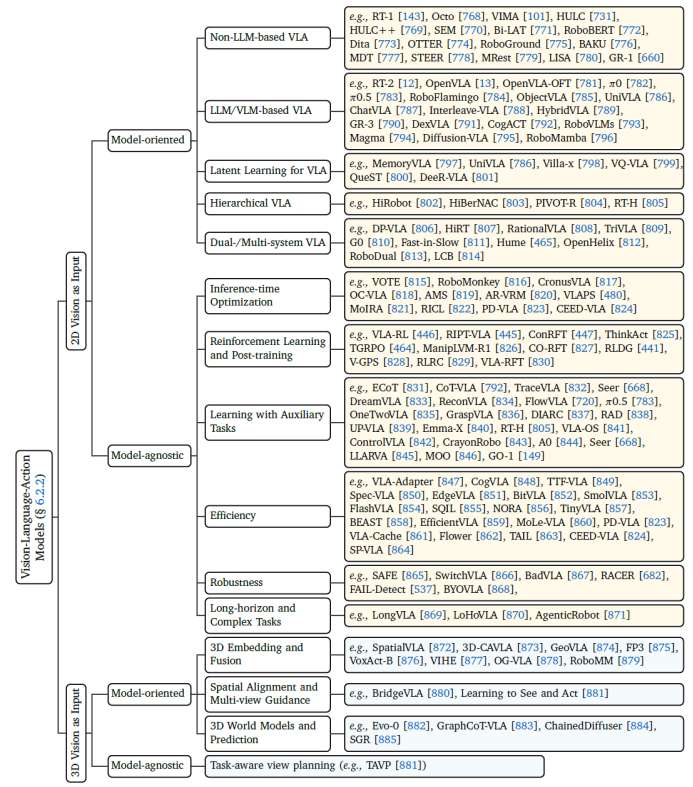 本综述系统梳理了机器人操作领域的整体格局,涵盖基础背景、按任务组织的基准与数据集、操作任务,以及现有方法的统一分类体系。我们在经典的“高层规划—低层控制”框架基础上进行了扩展:高层规划不仅包括任务规划,还进一步纳入了语言、代码、运动、可供性(affordance)与三维表示等方面;而在低层学习控制部分,我们提出了一种基于训练范式的全新分类方法,将其细分为输入建模(Input Modeling)、潜表征学习(Latent Learning)与策略学习(Policy Learning)三个核心组成部分。