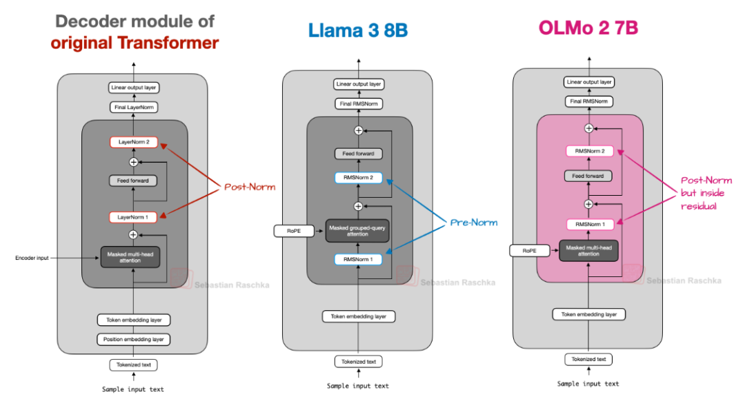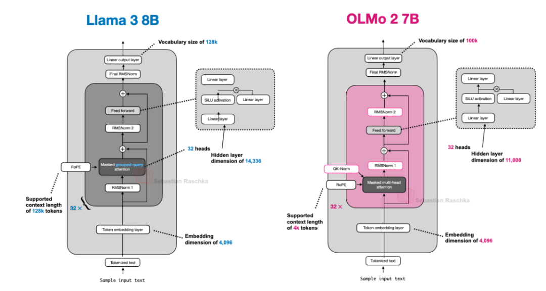下图展示了 Llama 3 和 OLMo 2 的架构对比。