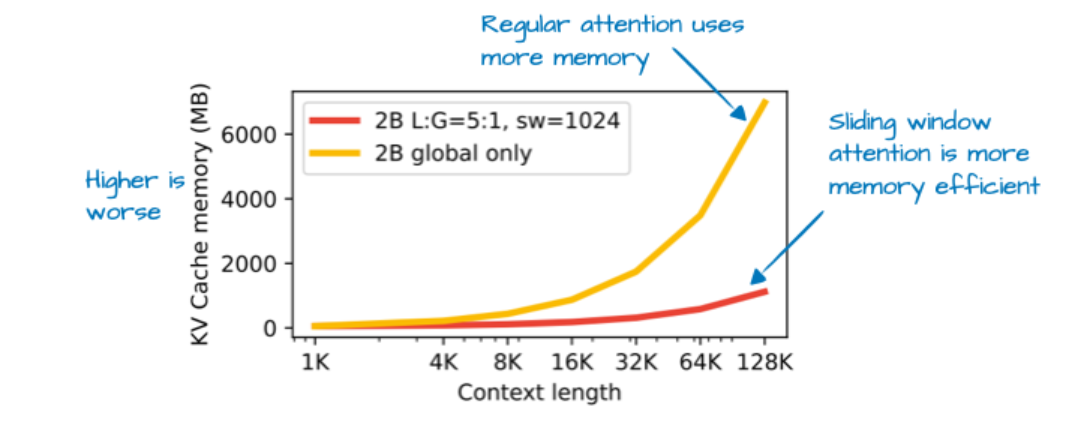 与传统的全局注意力机制相比,滑动窗口注意力在内存使用上带来了显著的优化,同时对模型的建模性能影响极小。这种设计使得 Gemma 3 在处理长序列时更加高效。 -