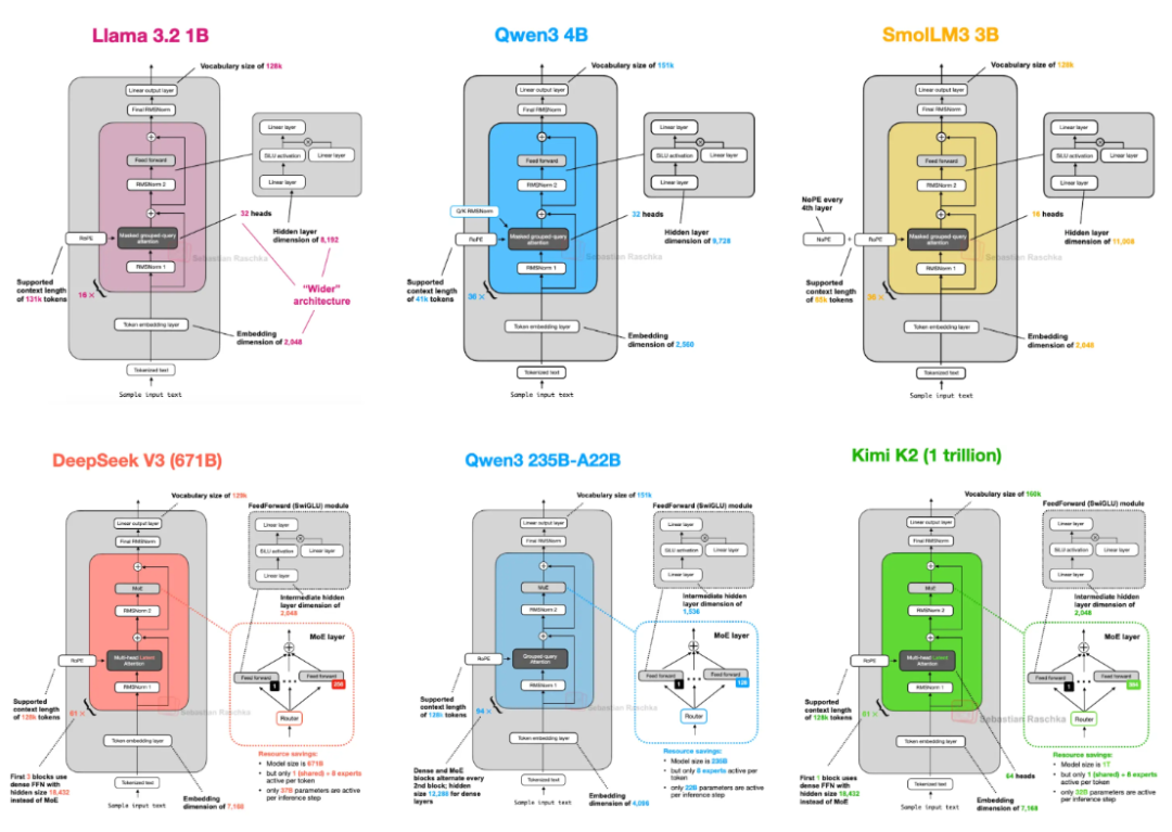 下文我们对主流的8个开源大模型(DeepSeek V3/R1、OLMo 2、Gemma 3、Mistral 3.1、Llama 4、Qwen 3、SmolLM3、Kimi K2)架构设计详细剖析之。
