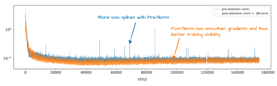 OLMo 2 采用了后归一化(Post-Norm)策略,这与大多数大语言模型(LLM)常用的前归一化(Pre-Norm)截然不同。这种架构设计的核心目的是提升训练过程的稳定性。