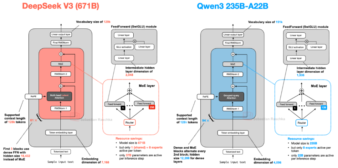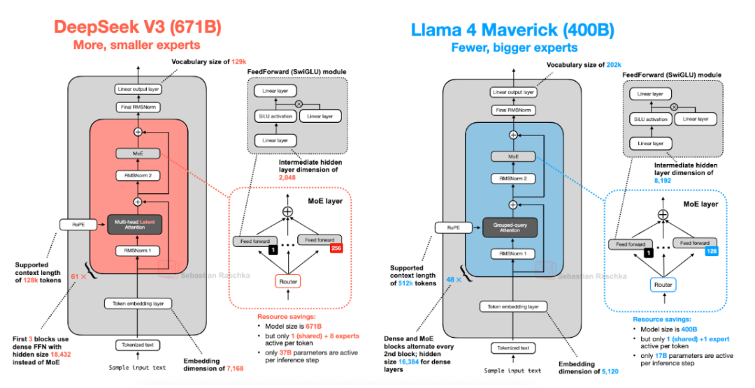 下图展示了 DeepSeek V3(6710 亿参数)和 Llama 4 Maverick(4000 亿参数)的架构对比。