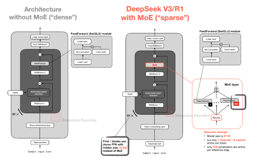 以 DeepSeek V3 为例,模型中包含 256 个专家层,但每次推理时,仅激活 9 个专家(1 个共享专家和 8 个由路由器选择的专家)。这种设计使得模型在推理时只需激活一小部分专家,从而显著降低了计算量。 - MoE 与传统前馈模块的对比