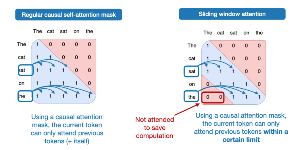 下图展示了常规注意力(左)和滑动窗口注意力(右)的对比。