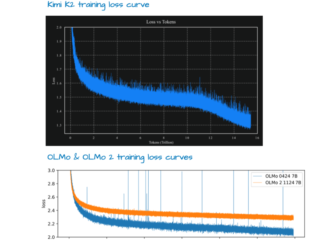 研究表明,后归一化在训练时更加稳定,尤其是在没有精心设计的学习率预热策略的情况下。OLMo 2 的训练损失曲线显示,这种设计在训练过程中表现得更为平稳。 -