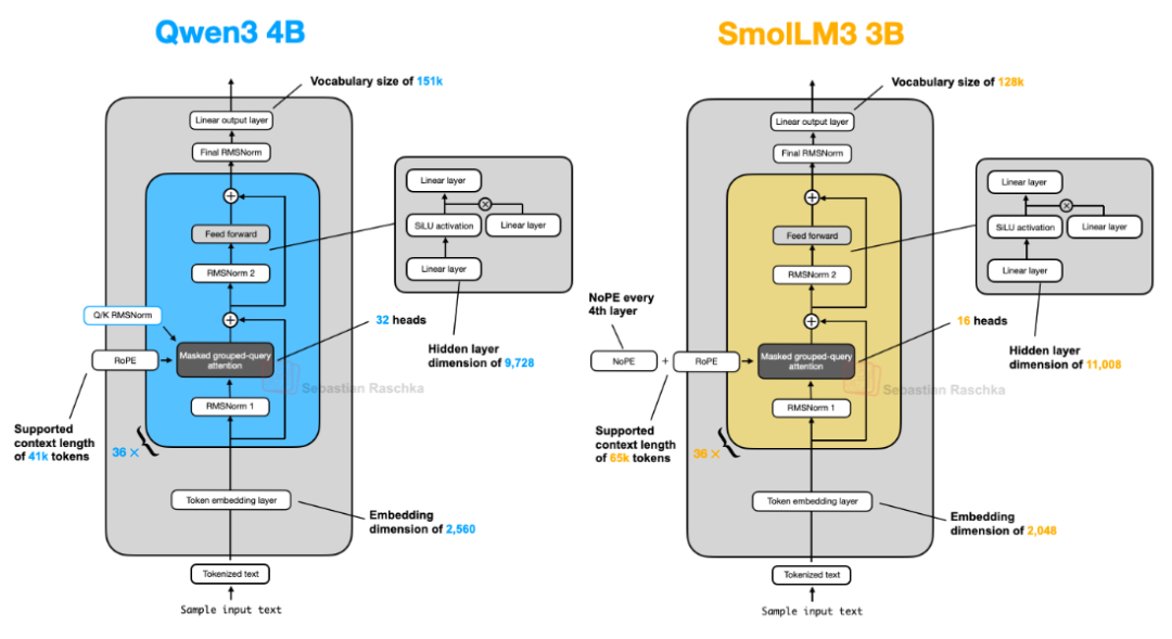 下图展示了 Qwen3 4B 和 SmolLM3 3B 的架构对比,注意 SmolLM3 中独特的 NoPE 设计。