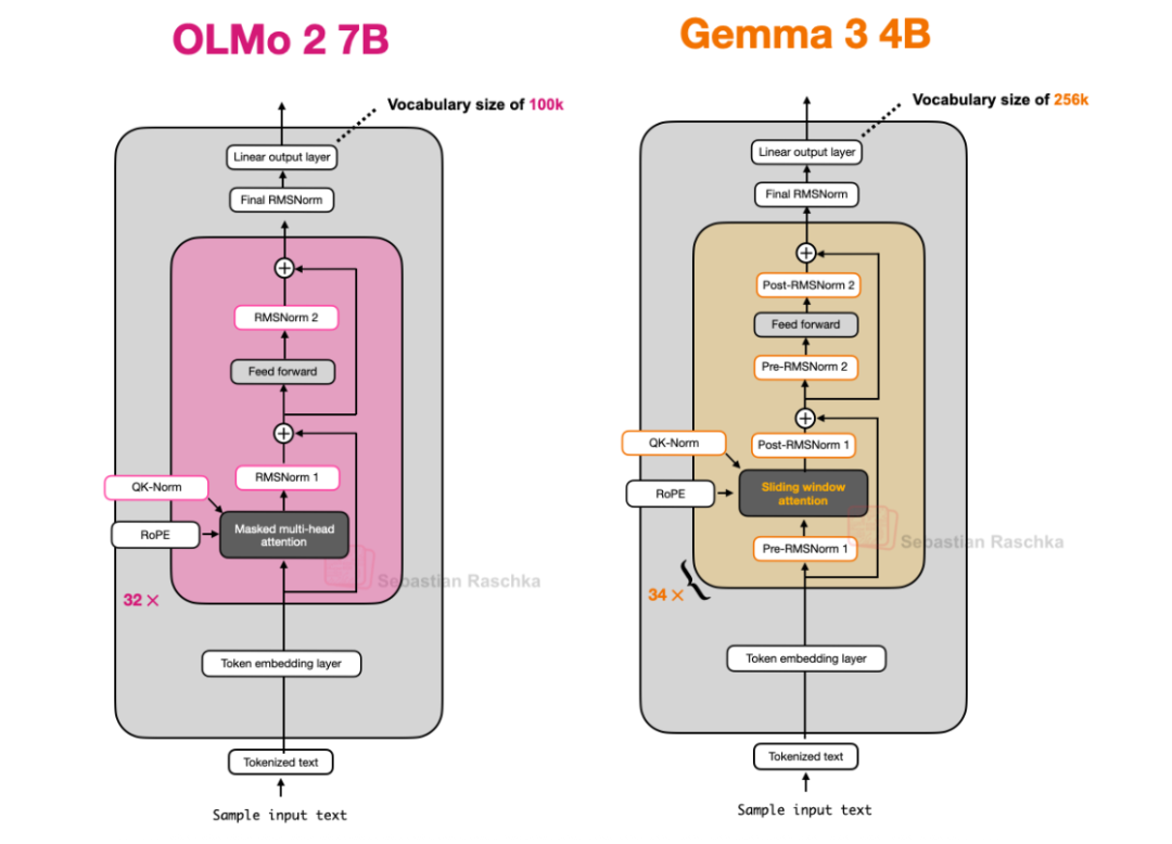 下图展示了 OLMo 2 和 Gemma 3 的架构对比,注意 Gemma 3 中额外的归一化层。