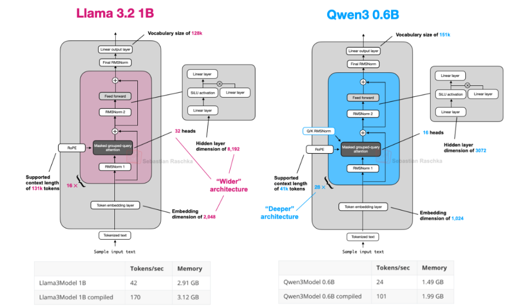Qwen3 0.6B 的密集模型采用了较深的架构,拥有更多的 Transformer 块,这意味着它有更多层次来逐步处理和理解输入信息。相比之下,Llama 3 1B 则是一种更宽的架构,它通过增加更多的注意力头来提升模型的并行处理能力。