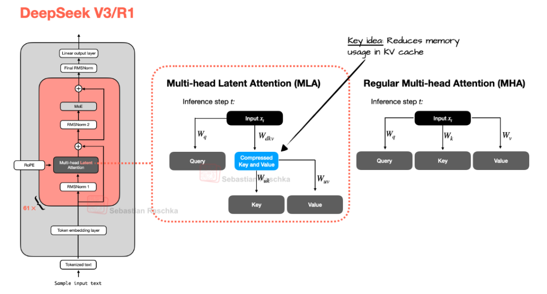 - 多头潜在注意力(MLA):通过压缩键和值张量,显著降低了内存占用,优化了推理效率。